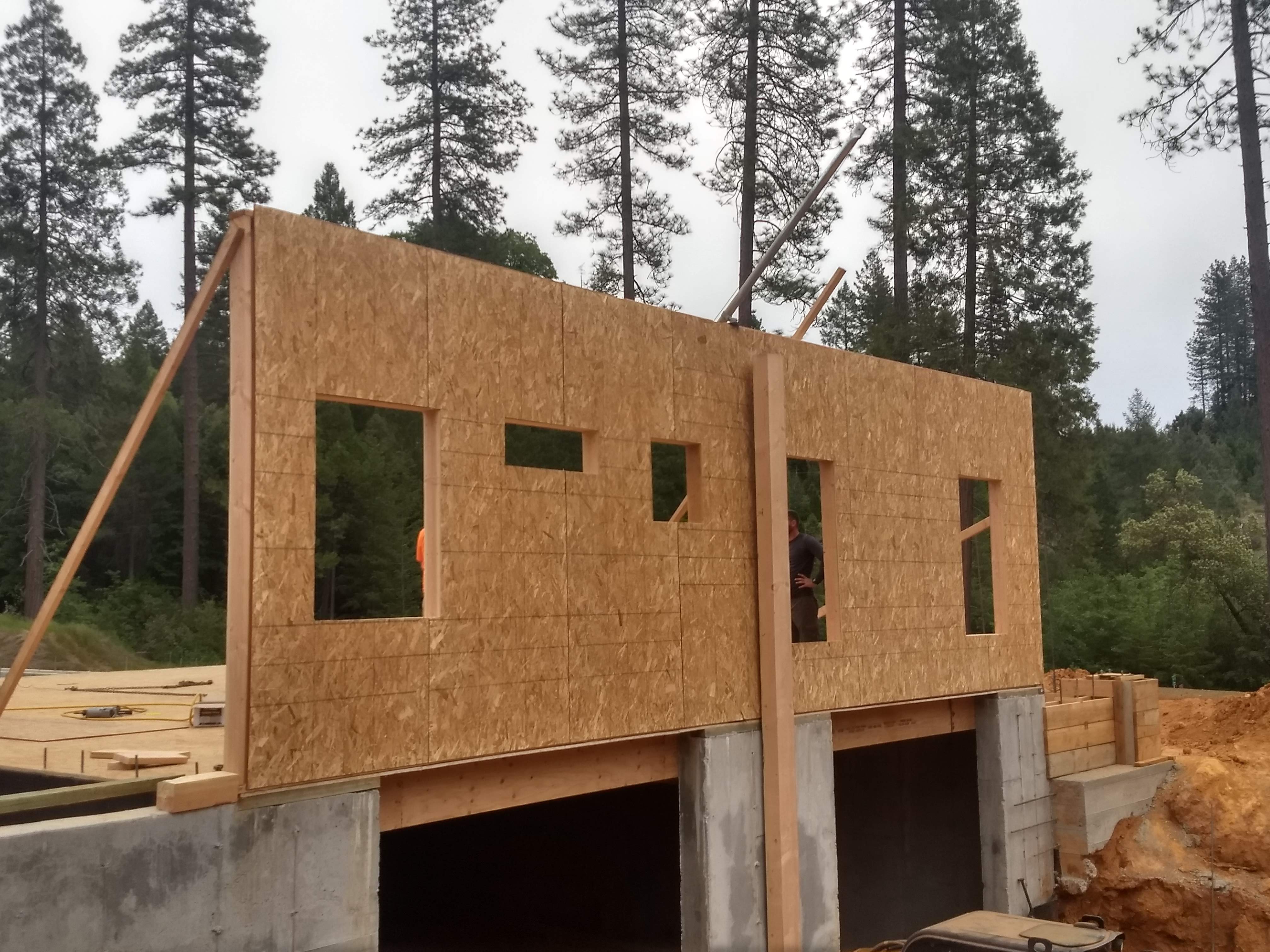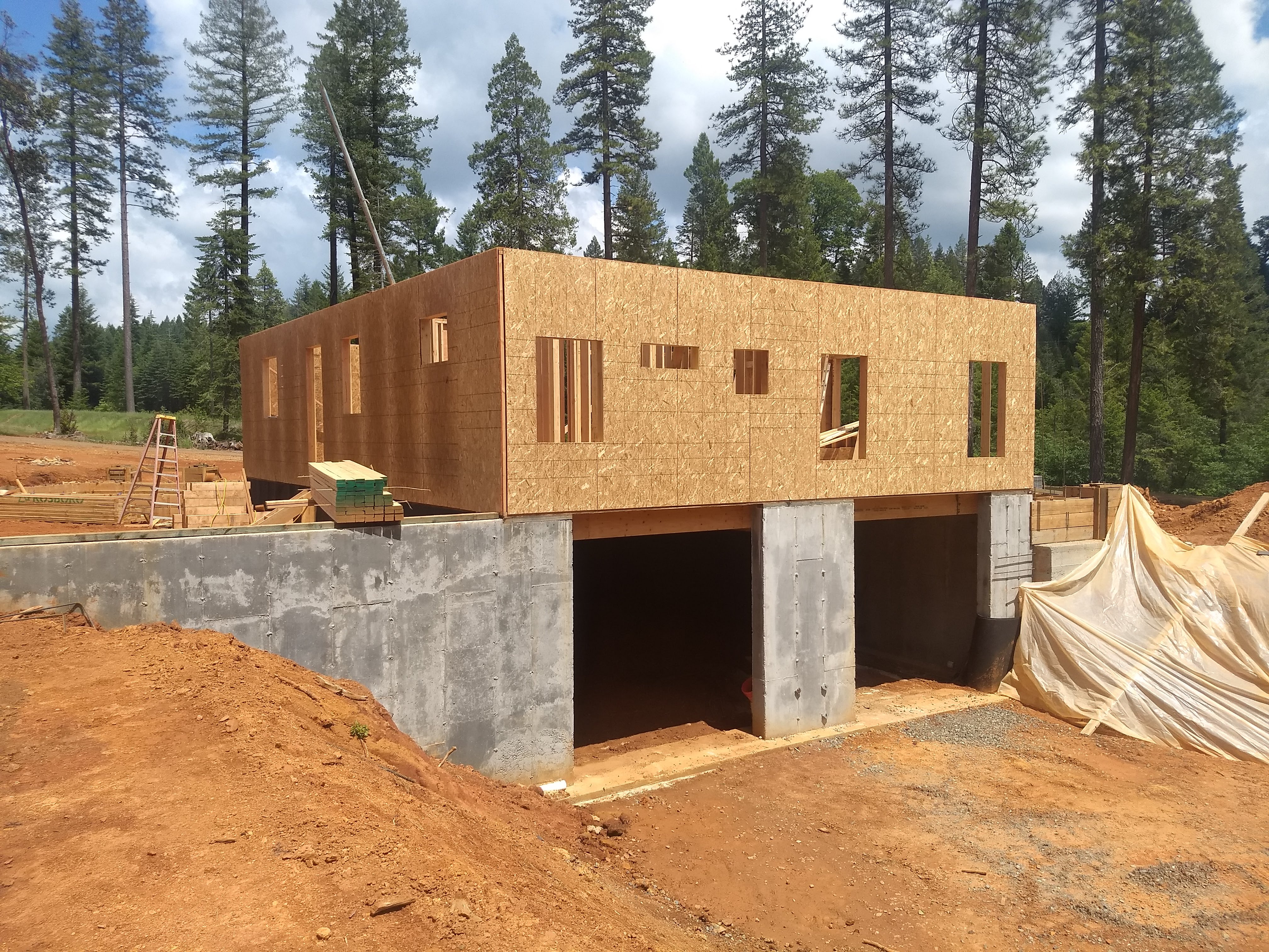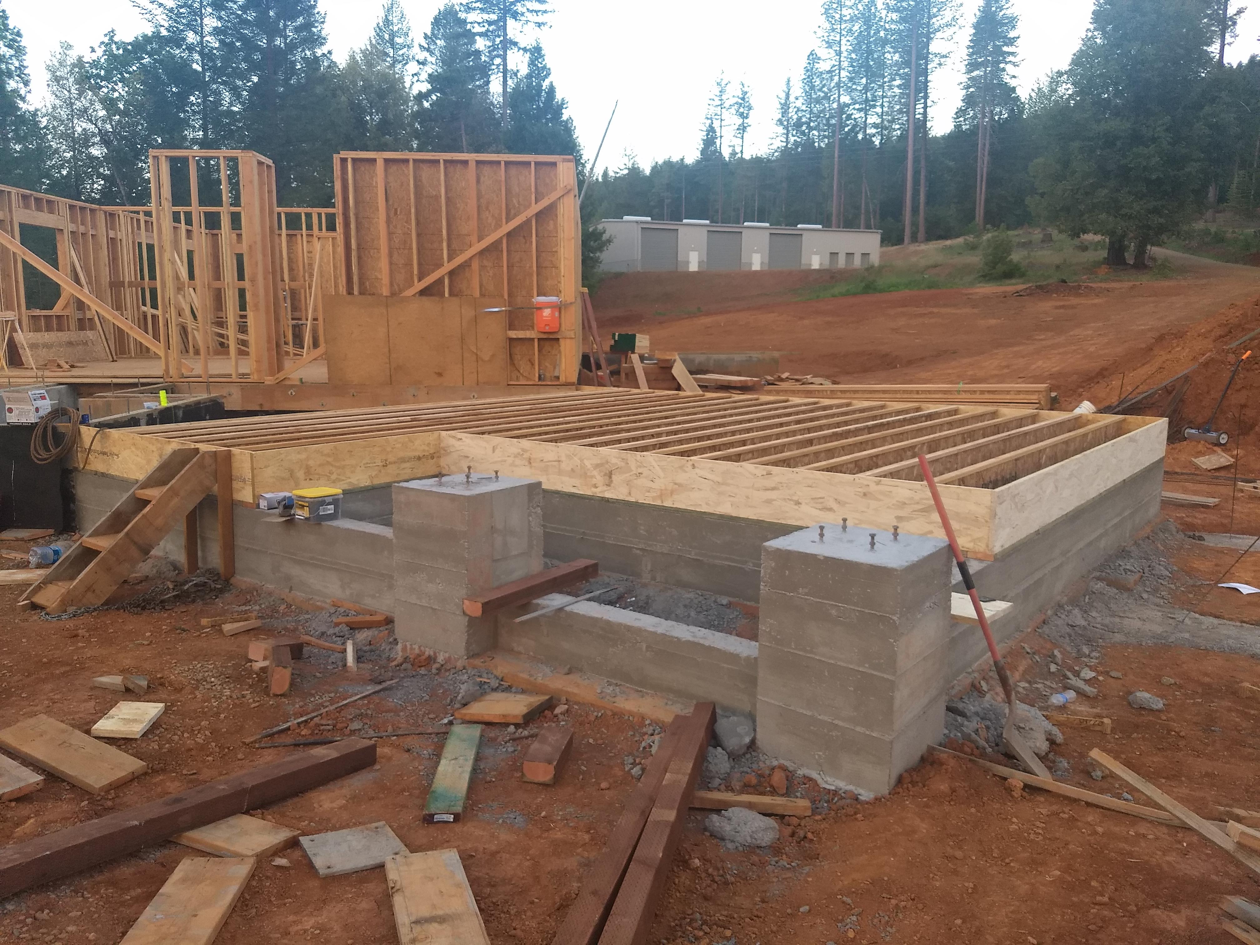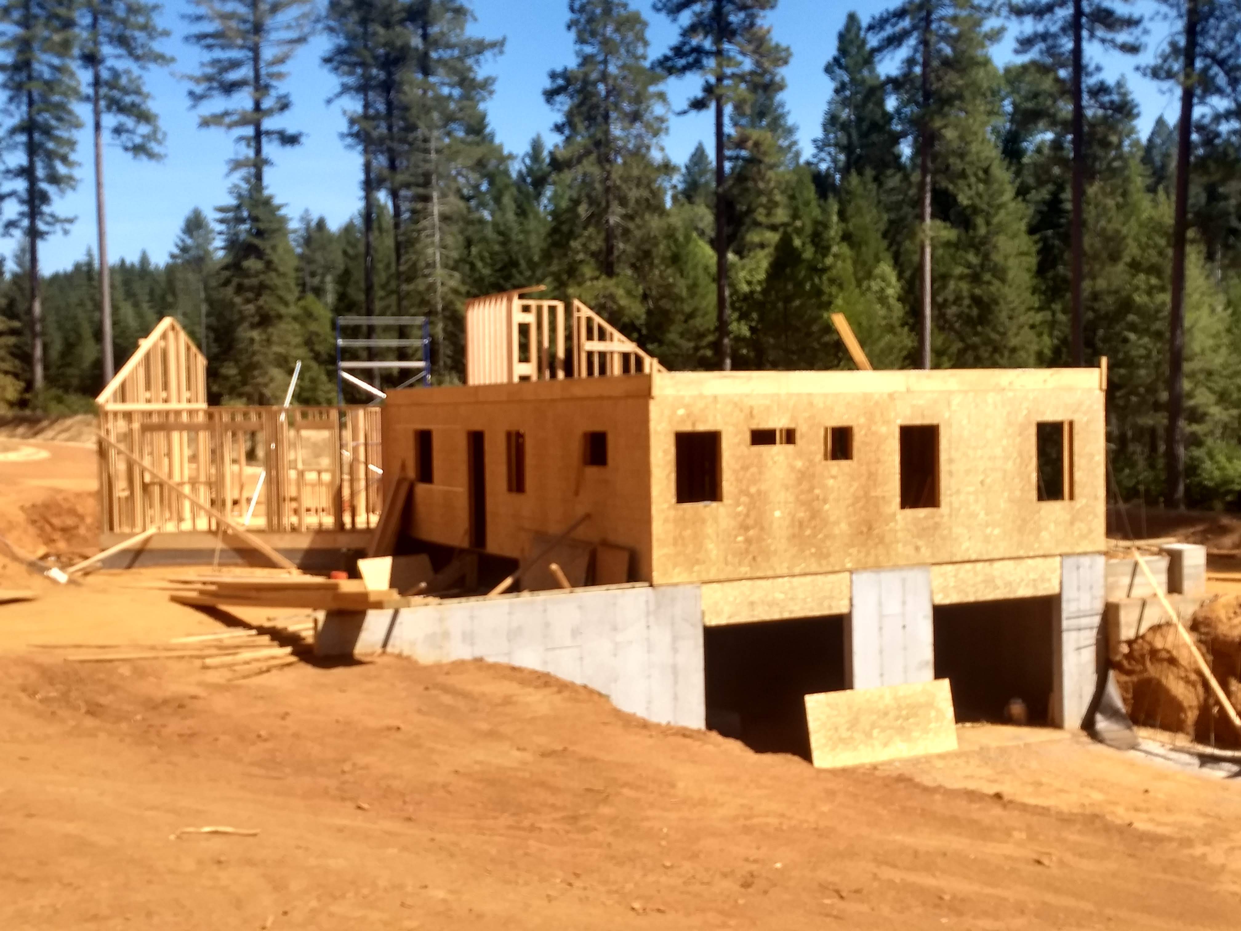 The first few months saw the mammoth walls of the drive-under garage being poured. These 10 foot tall walls are designed to hold up the other two floors of the house and will have a 2 car drive under garage hidden inside along with lots of storage for the occupants. Once the walls were complete, it was time for the first floor construction. The first wall was erected and everything has seemed to move at a fast pace since.