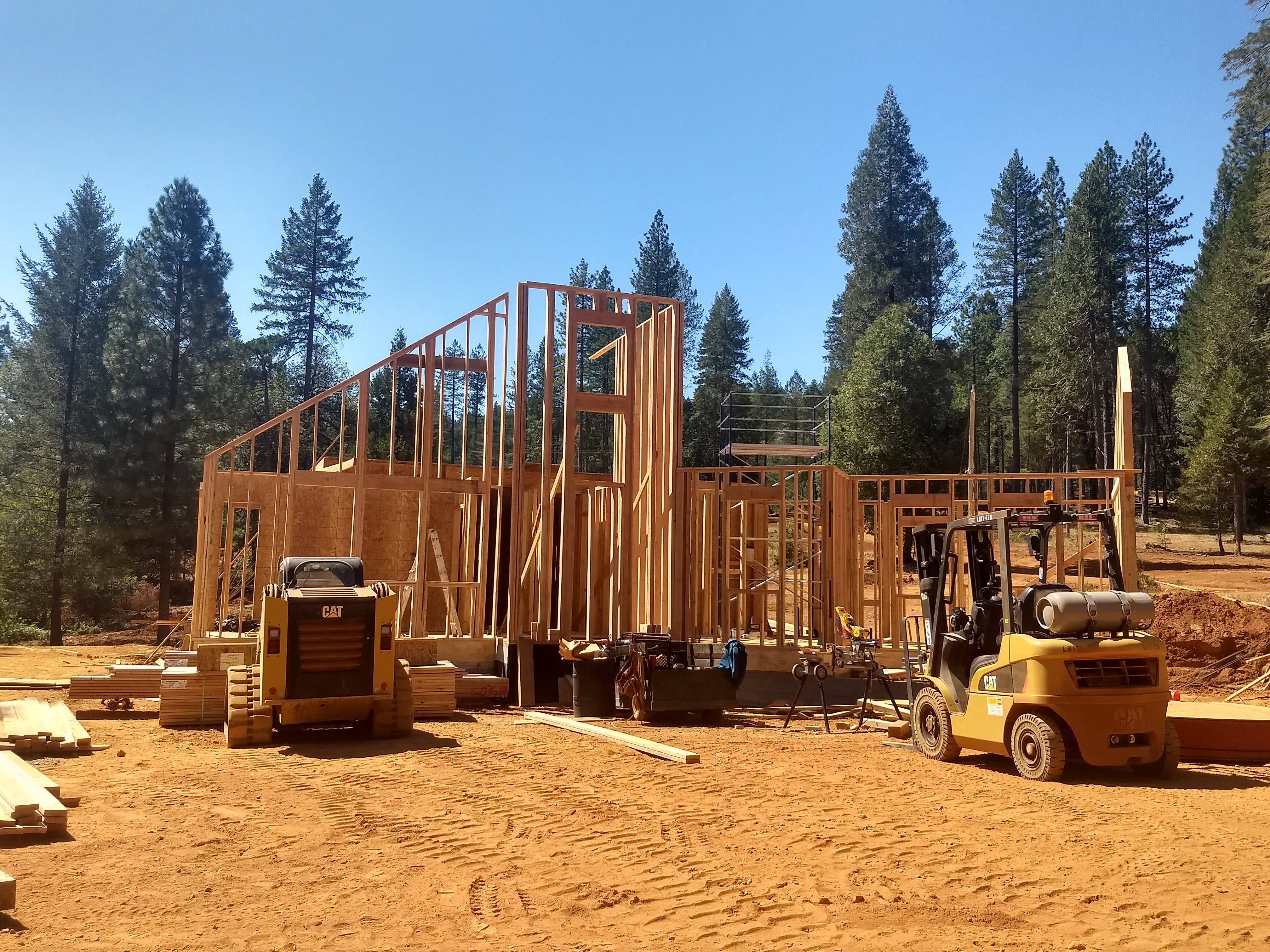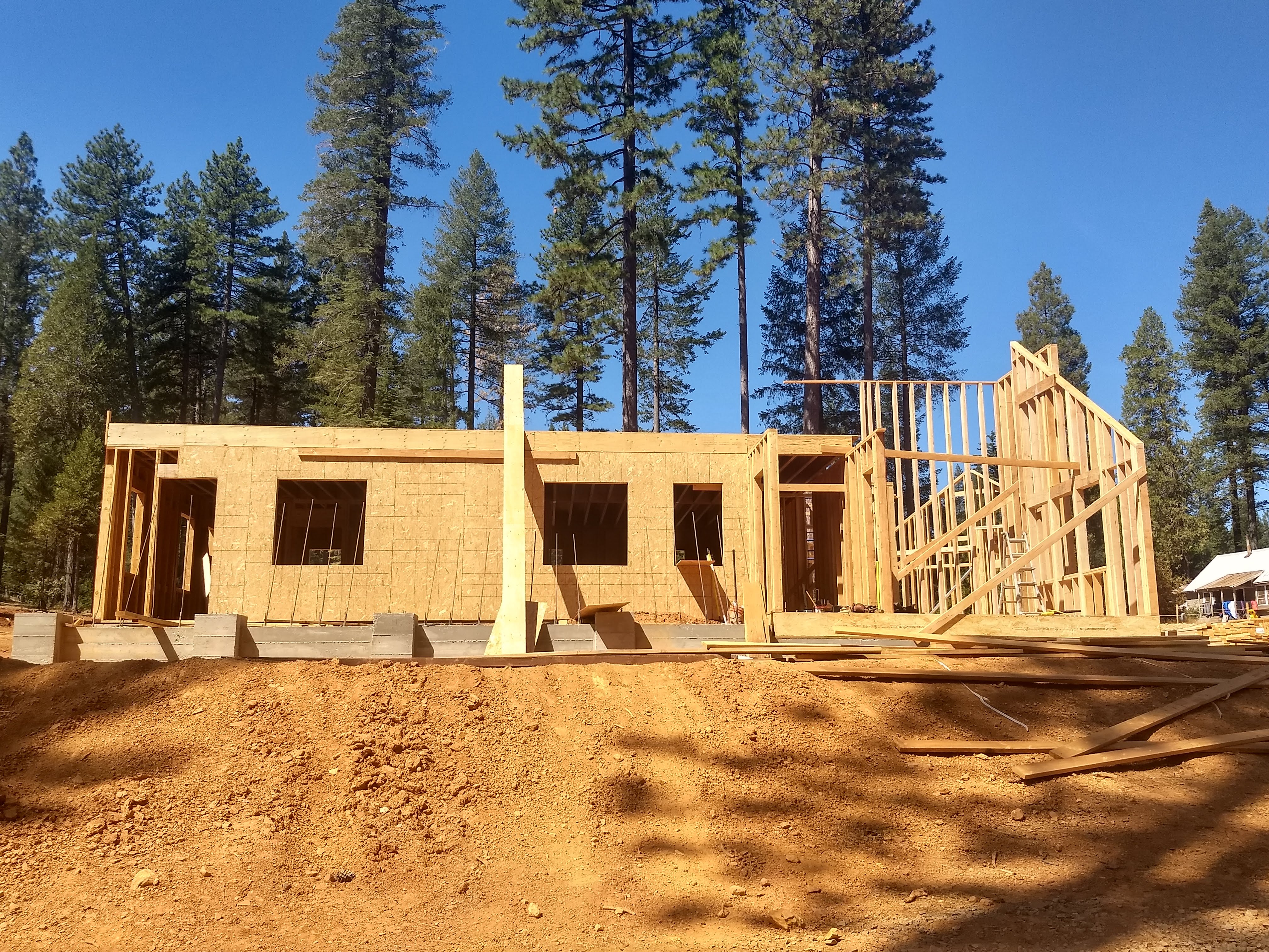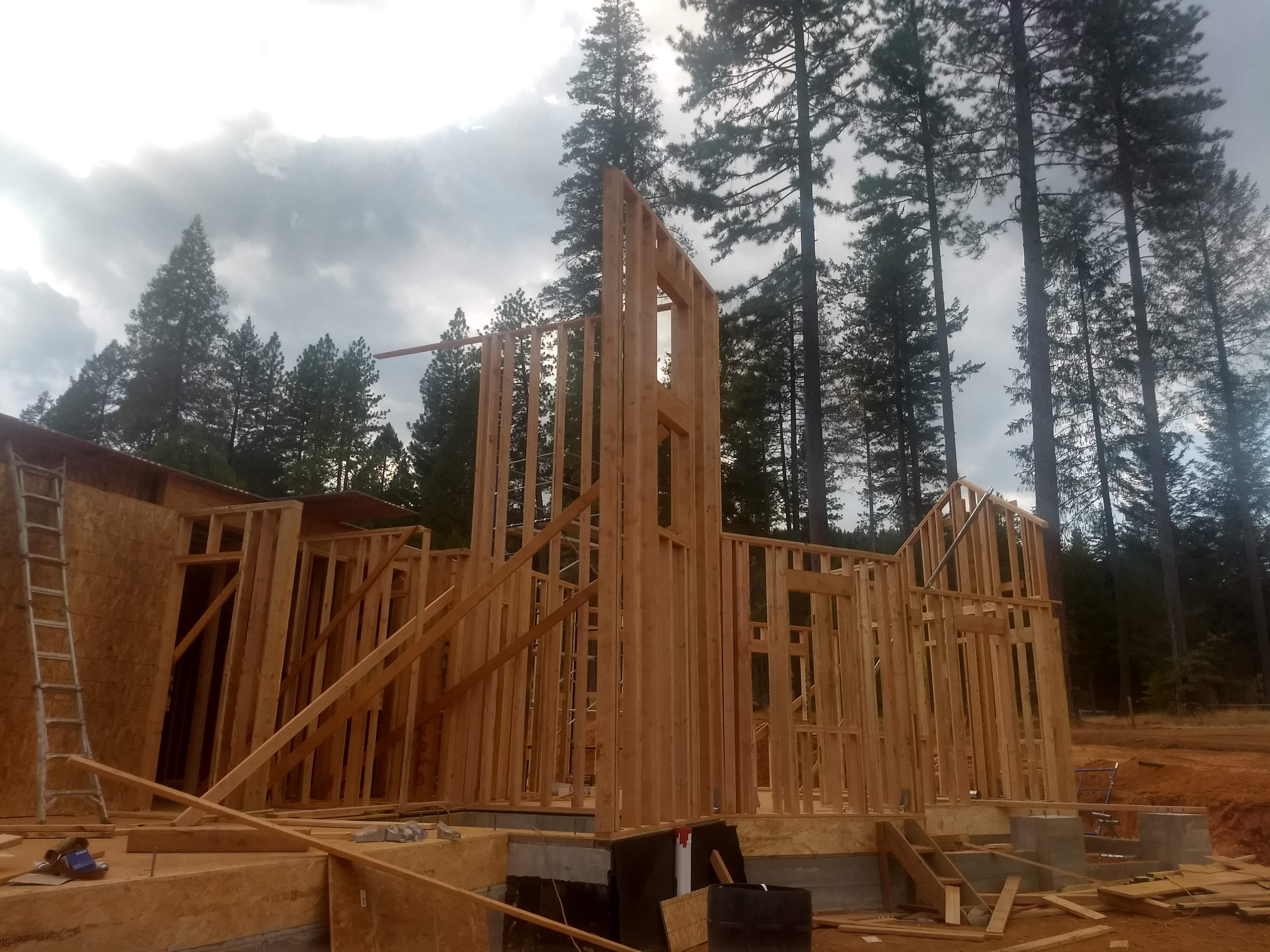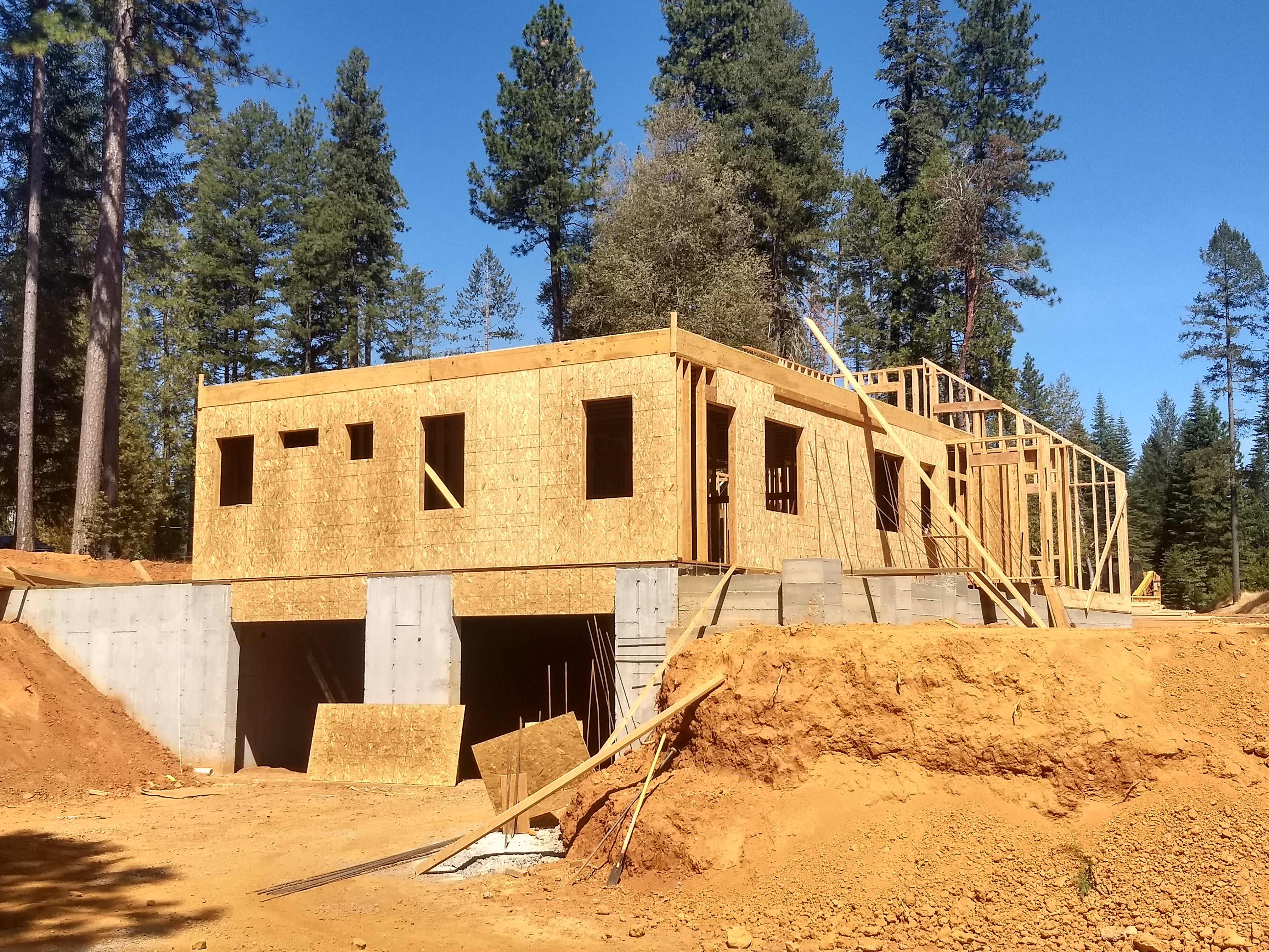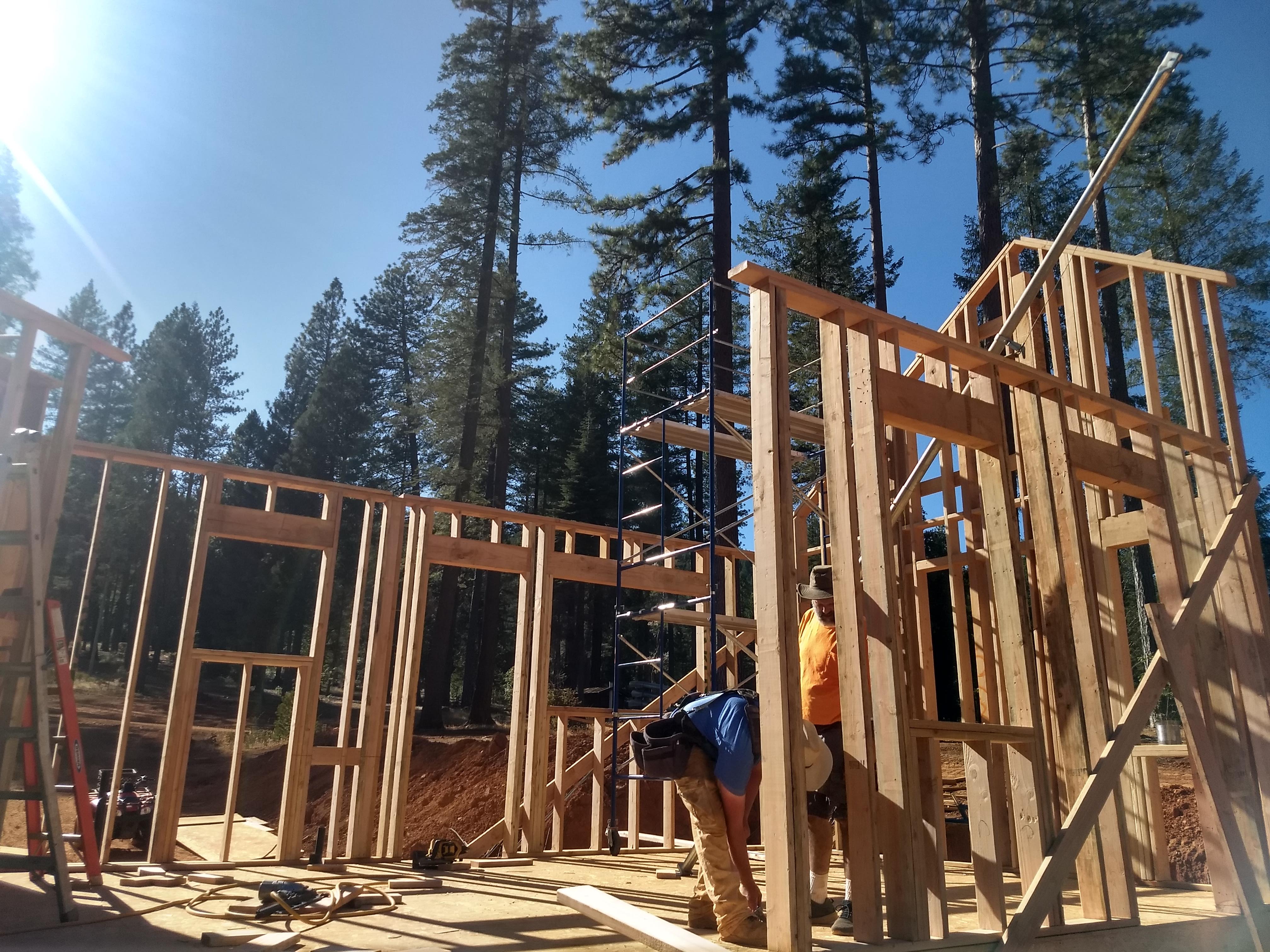 The first few months saw the mammoth walls of the drive-under garage being poured. These 10 foot tall walls are designed to hold up the other two floors of the house and will have a 2 car drive under garage hidden inside along with lots of storage for the occupants. Once the walls were complete, it was time for the first floor construction. The first wall was erected and everything has seemed to move at a fast pace since.
