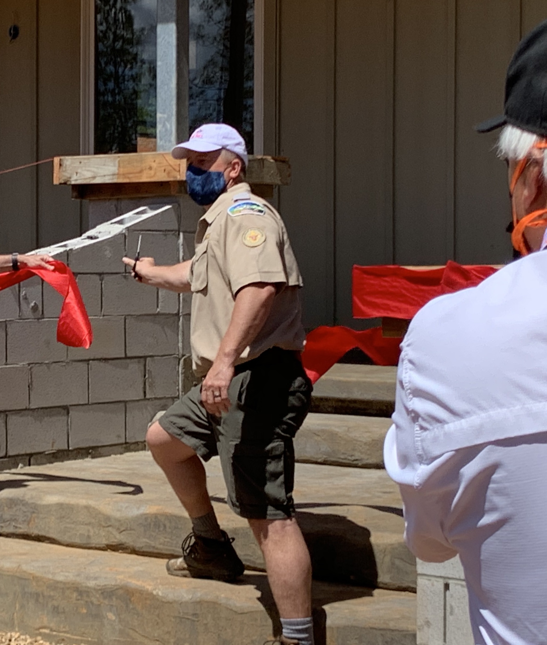 Even during these uncertain times, progress is still being made at NorCal–this past Friday a small group of GEC board members held an outdoor Board of Directors meeting to celebrate a number of achievements. With masks on and appropriately spaced camping chairs, the board conducted a ribbon cutting of the new Welcome Center, broke ground on the new Training Center site and conducted the first training related event on the site–a Wood Badge beading for three members of the Beaver Patrol from course WE-47-18-1.